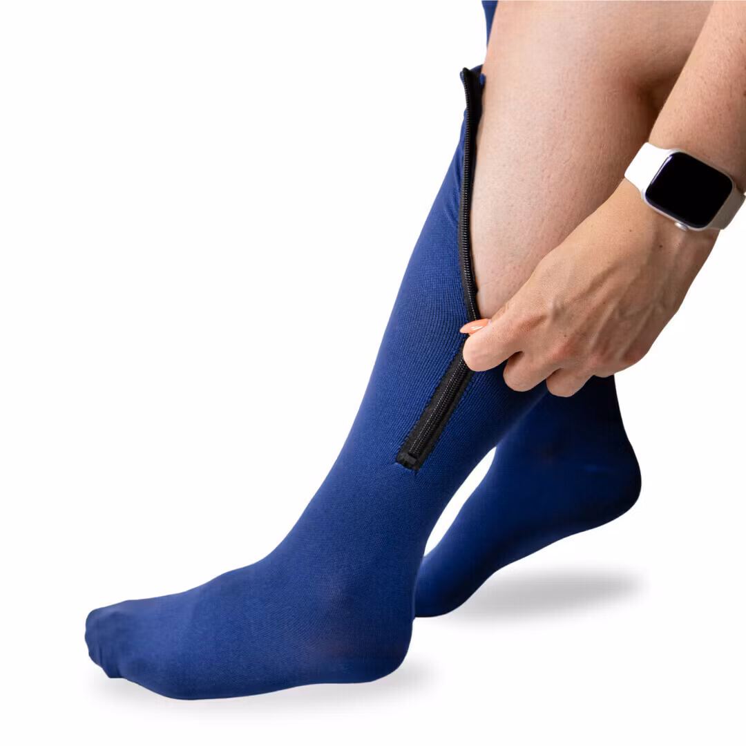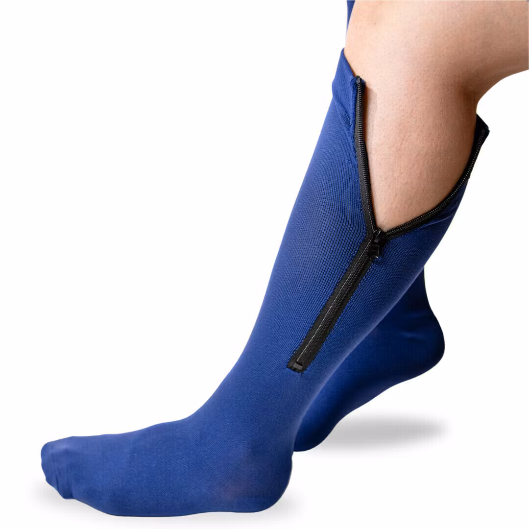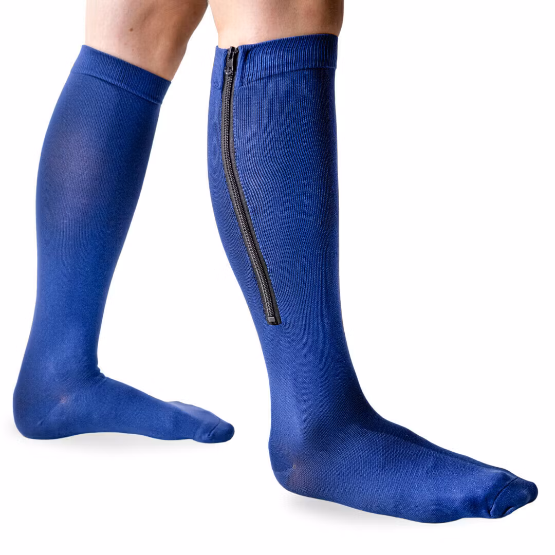 De här stödstrumporna har en dragkedja som gör att de är enkla att ta av och på, samtidigt som de ger samma hälsofördelar och är lika bekväm som stödstrumpor utan dragkedja.